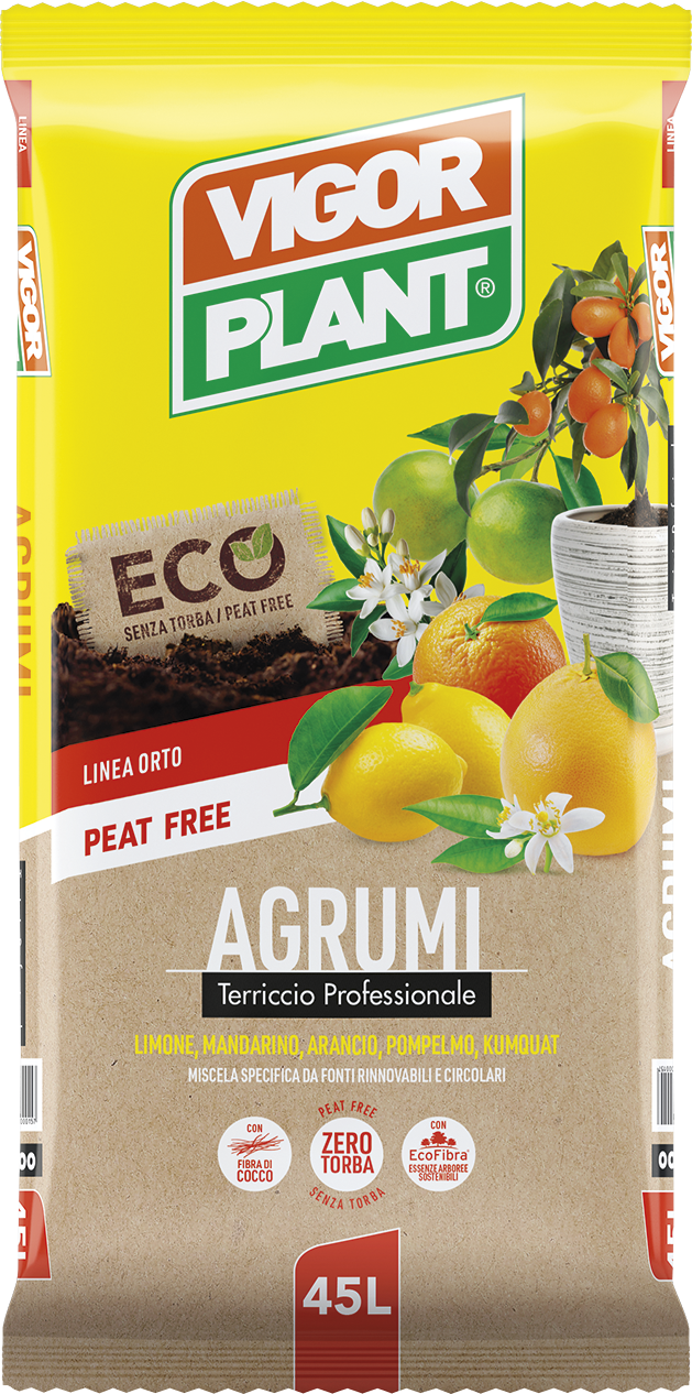 Terriccio per Agrumi Peat Free è una soluzione professionale ad alto valore ambientale, completamente priva di torba. Grazie alla sua composizione innovativa, questo substrato rappresenta una scelta sostenibile capace di garantire elevate prestazioni agronomiche. Formulato specificamente per soddisfare le esigenze colturali degli agrumi, garantisce un perfetto equilibrio tra ritenzione idrica e aerazione radicale, elementi fondamentali per una crescita sana e produttiva. La presenza di Ecofibra®, fibra vegetale ad alta porosità 100% sostenibile, contribuisce al raggiungimento del corretto livello di umidità migliorando al contempo gli scambi gassosi. La fibra di cocco prelavata e calibrata, naturalmente rinnovabile, favorisce il trattenimento dell’umidità e un’ottimale ossigenazione dell’apparato radicale, garantendo le condizioni ideali per la coltivazione degli agrumi. Durante la fase vegetativa, questo terriccio sostiene un’elevata disponibilità di acqua e nutrienti, mentre nella stagione di stasi vegetativa garantisce un rapido drenaggio, prevenendo efficacemente i ristagni idrici. La concimazione bilanciata completa la formulazione, assicurando una nutrizione costante, duratura e priva di eccessi salini. Scegliere questo terriccio significa coltivare nel rispetto dell’ambiente, senza rinunciare alla qualità e alla salute delle tue piante.