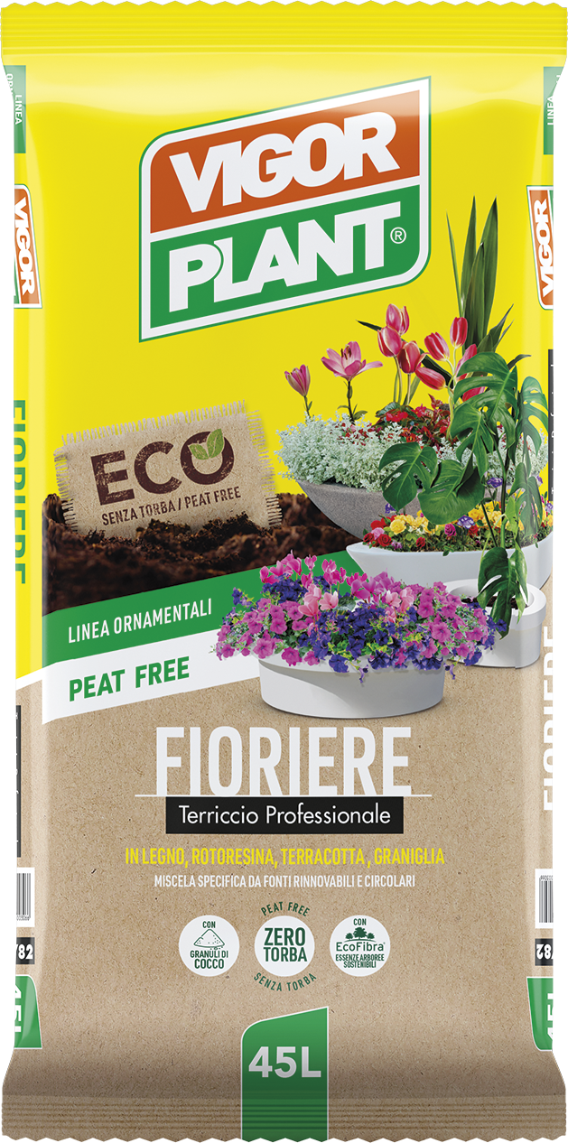 Fioriere Peat Free è un substrato innovativo completamente privo di torba, studiato per offrire una struttura stabile e duratura, ideale per la messa a dimora di piante da fiore e da frutto in vaso o in fioriera. La miscela anticompattante assicura porosità, drenaggio e aerazione, creando un ambiente favorevole allo sviluppo radicale nel lungo periodo, trattenendo l’umidità necessaria anche nei mesi più caldi. Frutto della Ricerca & Sviluppo Vigorplant, il substrato nasce da anni di sperimentazione nel settore professionale per garantire prestazioni elevate in assenza di torba. La presenza di EcoFibra®, fibra vegetale ad alta porosità 100% sostenibile, migliora la struttura del terriccio e favorisce l’attività dell’apparato radicale che, in sinergia con la fibra di cocco, ottenuta dal mallo della noce, assicura stabilità, drenaggio e distribuzione uniforme dell’acqua, riducendo eventuali eccessi di umidità. Completano la formulazione l’humus di corteccia, fonte naturale di sostanza organica e nutrienti, inerti come il lapillo vulcanico e la pomice che migliorano ulteriormente drenaggio e ossigenazione del substrato, creando un ambiente equilibrato per la crescita sana e vigorosa delle piante. Fioriere Peat Free è la scelta sostenibile per chi desidera un terriccio professionale, performante e rispettoso dell’ambiente.